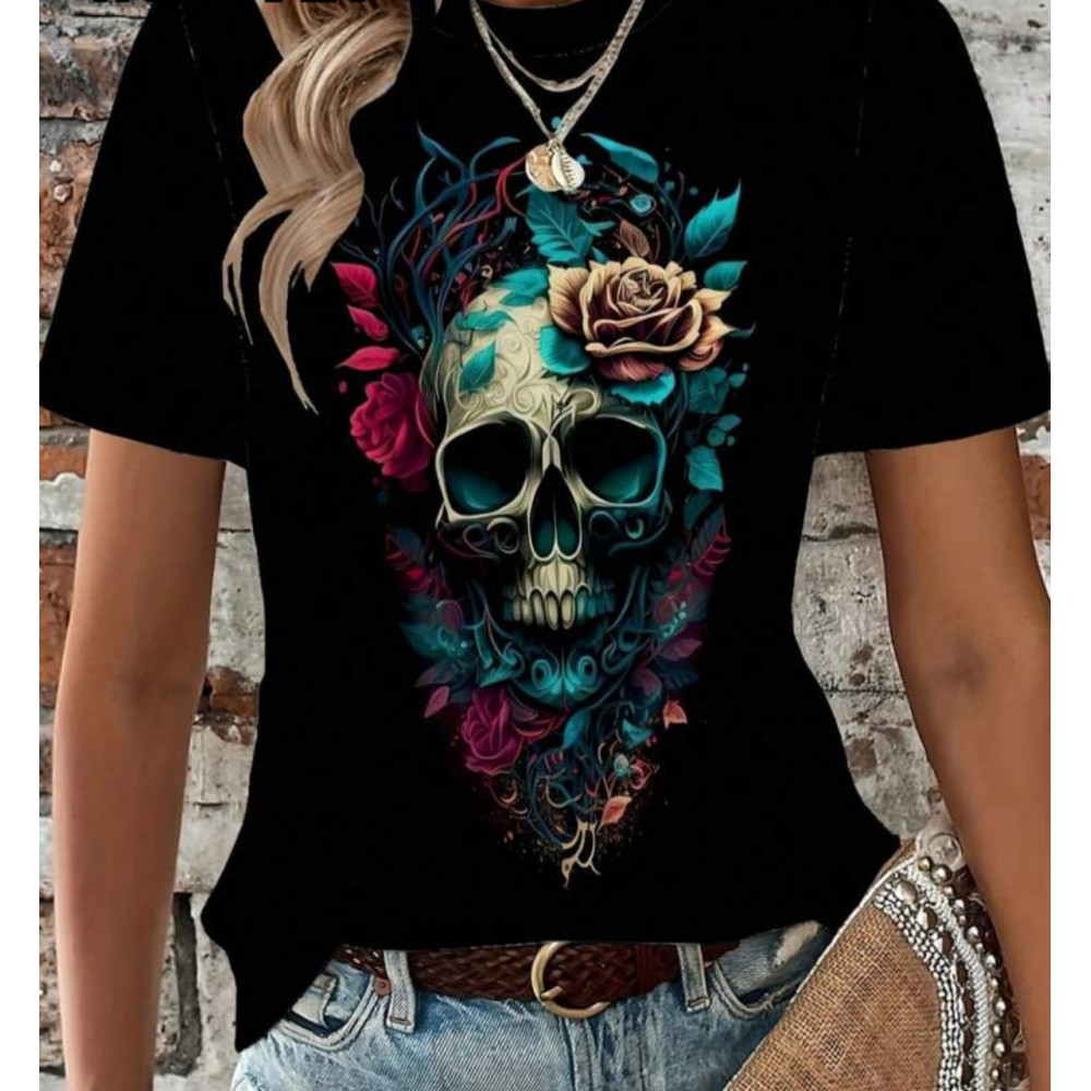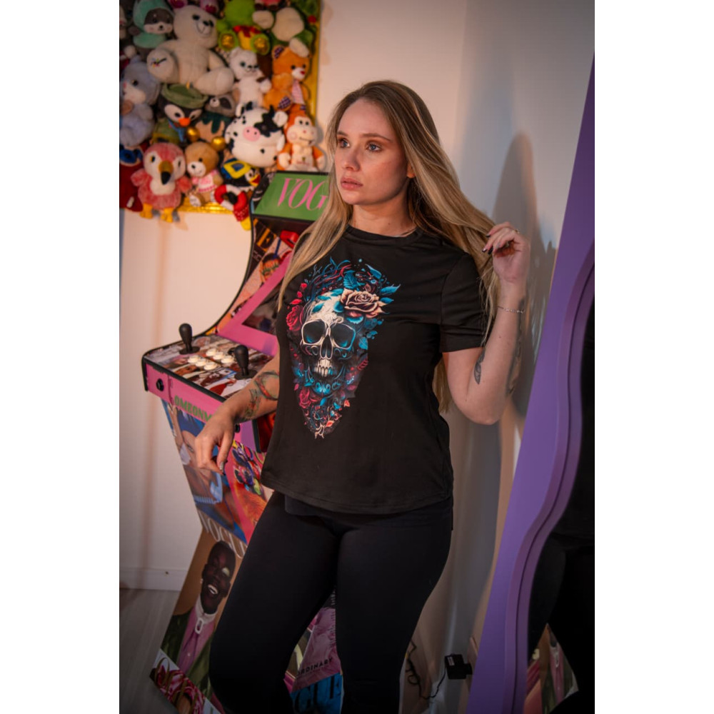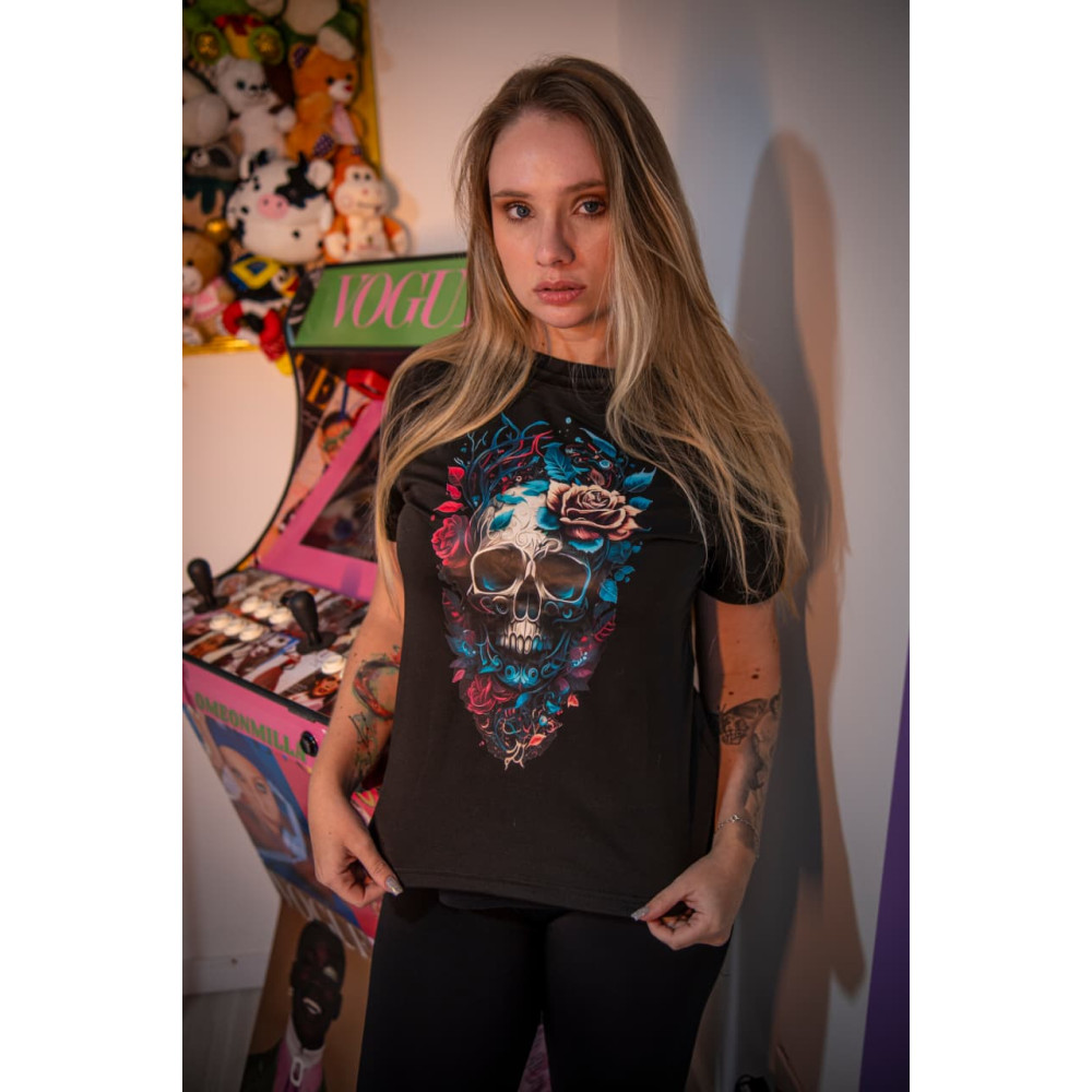 Camiseta Feminina de manga curta com decote redondo e estampa de caveira.