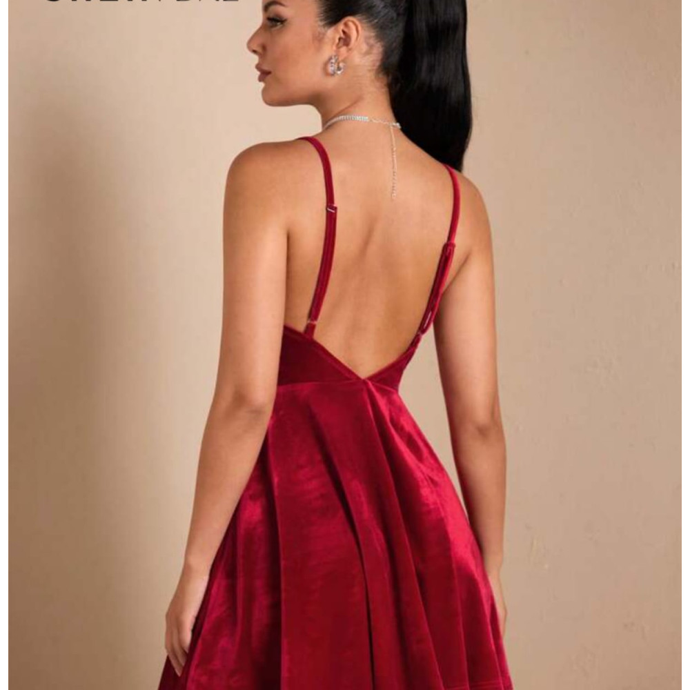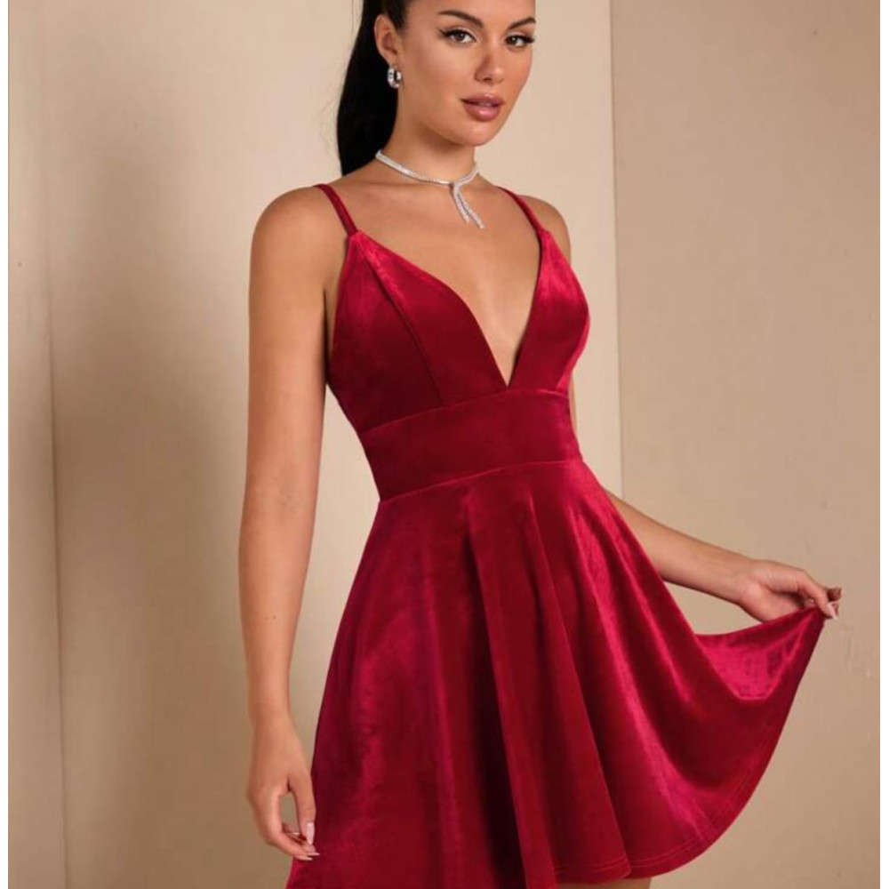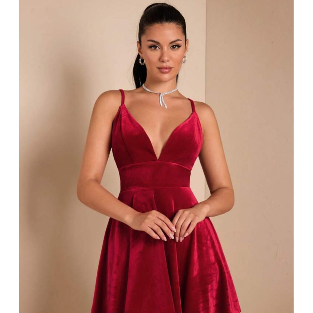 Vestido de veludo vermelho curto com decote V profundo e costas abertas.