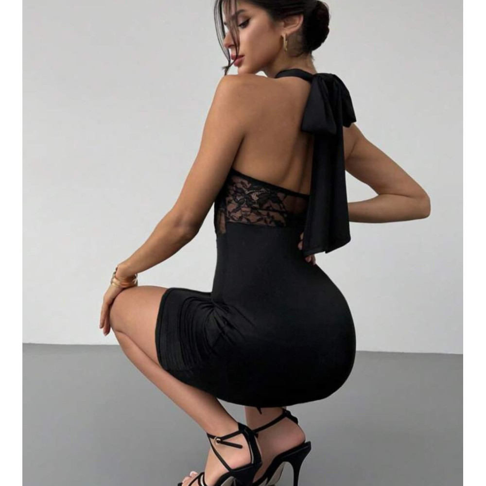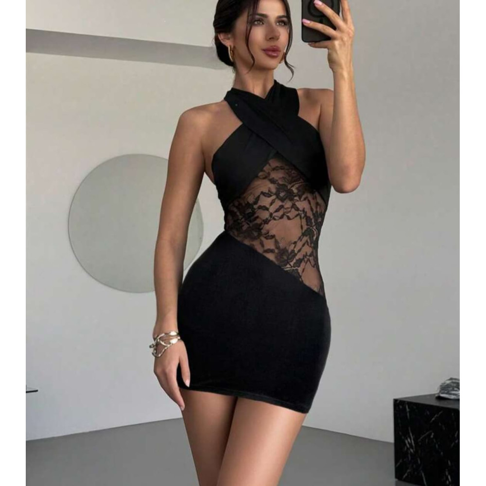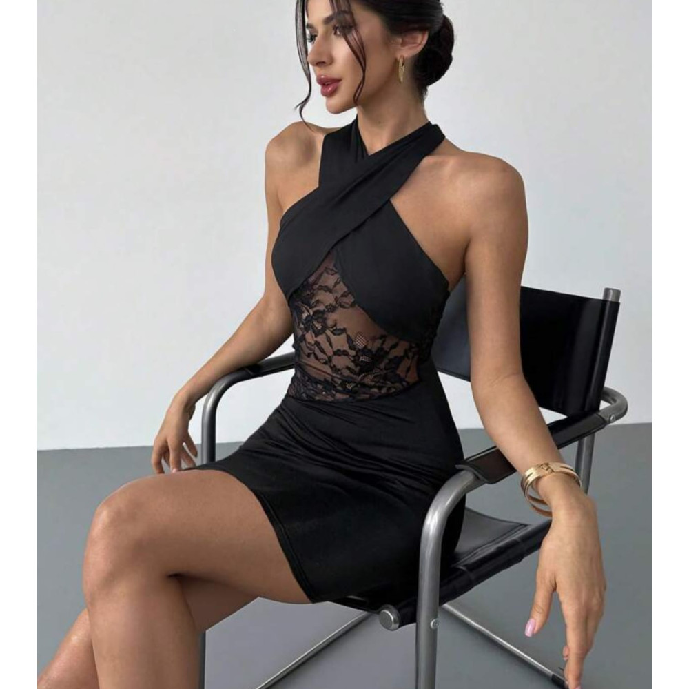 Vestido preto romântico e elegante, curto com detalhes em renda.